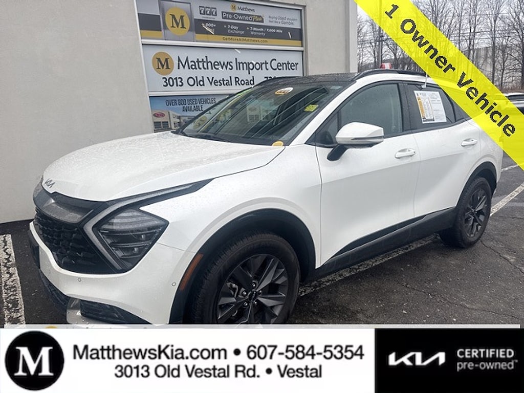 "Matthews Import Center promises each customer a thorough and confident 120-point inspection on our used inventory guaranteeing a relaxing and peace-of-mind experience. We are located behind Lowes in Vestal NY. Or call us at (607) 729 - 6261Matthews Import Center3013 Old Vestal RoadVestal NY 13850. Certified. Snow White Pearl 2023 Kia SX-Prestige Sportage Hybrid AWD 6-Speed Automatic 1.6L Turbo GDI 4-CylinderOdometer is 5903 miles below market average! 38/38 City/Highway MPGKia Certified Pre-Owned Details: * Powertrain Limited Warranty: 120 Month/100000 Mile (whichever comes first) from original in-service date * Transferable Warranty * 165 Point Inspection * Limited Warranty: 12 Month/12000 Mile (whichever comes first) ""Platinum Coverage""from certified purchase date * Roadside Assistance * Includes Rental Car and Trip Interruption Reimbursement. 3 month Sirius trial subscription * Vehicle History * Warranty Deductible: $50"