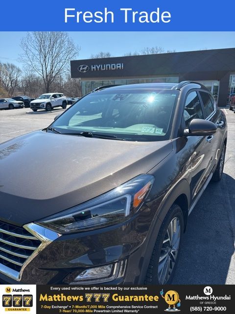 Mileage: 46,396 miles miles, MPG Range: 21/26 mpg, Engine: 2.4L i-4, Transmission: Automatic, Drive Line: AWD, Exterior Color: Sage Brown, Interior Color: Black,Stock #: GC23706A, Location: Matthews Hyundai of Greece, Comments: Sage Brown 2020 Hyundai Tucson Ultimate AWD 6-Speed Automatic with Shiftronic 2.4L I4 DGI DOHC 16V AWD, 18" x 7.0J Alloy Wheels, 4-Wheel Disc Brakes, 8 Speakers, ABS brakes, Air Conditioning, Alloy wheels, AM/FM radio: SiriusXM, Apple CarPlay & Android Auto, Auto High-beam Headlights, Auto-dimming Rear-View mirror, Automatic temperature control, Axle Ratio: 3.195, Brake assist, Bumpers: body-color, Carpeted Floor Mats, Delay-off headlights, Driver door bin, Driver vanity mirror, Dual front impact airbags, Dual front side impact airbags, Electronic Stability Control, Emergency communication system, Exterior Parking Camera Rear, Four wheel independent suspension, Front anti-roll bar, Front Bucket Seats, Front Center Armrest, Front dual zone A/C, Front fog lights, Front reading lights, Fully automatic headlights, Garage door transmitter: HomeLink, Heated & Ventilated Front Bucket Seats, Heated door mirrors, Heated front seats, Heated rear seats, Heated steering wheel, Illuminated entry, Leather Seat Trim, Leather Shift Knob, Low tire pressure warning, Mudguards, Navigation System, Occupant sensing airbag, Option Group 01, Outside temperature display, Overhead airbag, Overhead console, Panic alarm, Passenger door bin, Passenger vanity mirror, Power door mirrors, Power driver seat, Power Liftgate, Power moonroof, Power passenger seat, Power steering, Power windows, Radio: Infinity Audio System w/Navigation, Rain sensing wipers, Rear anti-roll bar, Rear reading lights, Rear seat center armrest, Rear window defroster, Rear window wiper, Remote keyless entry, Reversible Cargo Tray, Roof rack: rails only, Security system, Speed control, Speed-sensing steering, Split folding rear seat, Spoiler, Steering wheel mounted audio controls, Tachometer, Telescoping steering wheel, Tilt steering wheel, Traction control, Trip computer, Turn signal indicator mirrors, Variably intermittent wipers, Ventilated front seats, Wheel Locks.