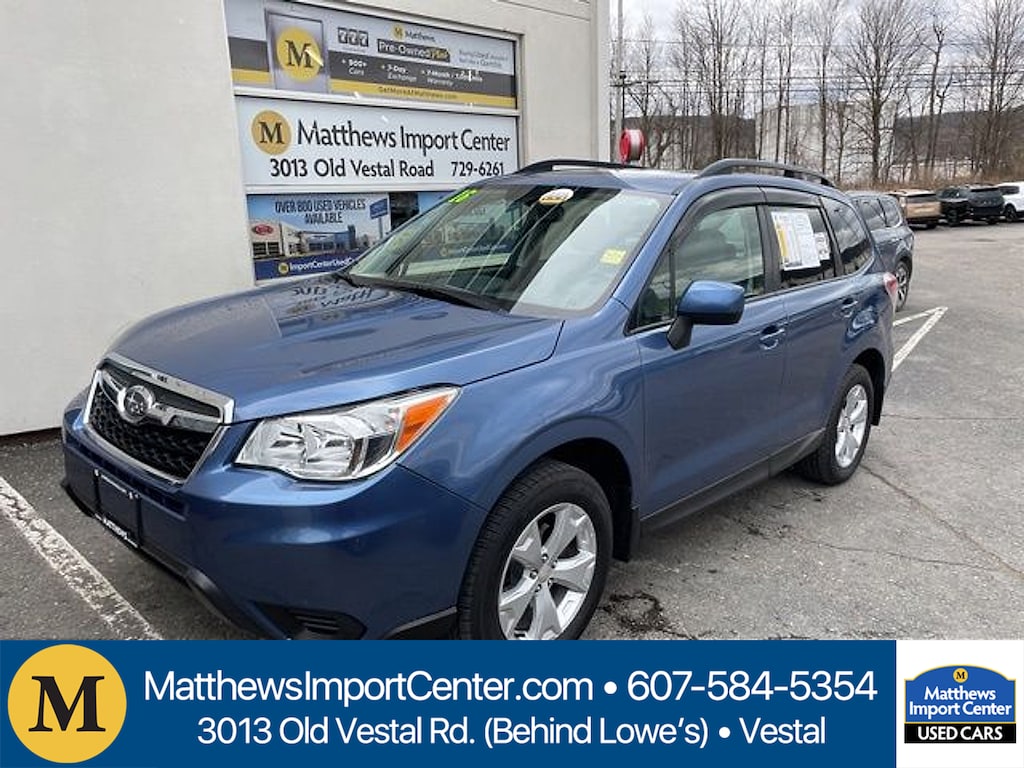 Matthews Import Center promises each customer a thorough and confident 120-point inspection on our used inventory guaranteeing a relaxing and peace-of-mind experience. We are located behind Lowes in Vestal NY. Or call us at (607) 729 - 6261Matthews Import Center3013 Old Vestal RoadVestal NY 13850. Quartz Blue Pearl 2016 Subaru 2.5i Premium Forester AWD Lineartronic CVT 2.5L 4-Cylinder DOHC 16V VVTOdometer is 71508 miles below market average! 24/32 City/Highway MPGAwards: * 2016 IIHS Top Safety Pick+ * 2016 KBB.com 10 Best SUVs Under $25000 * 2016 KBB.com Best Resale Value Awards * 2016 KBB.com 10 Best All-Wheel Drive Vehicles Under $25000 * 2016 KBB.com Brand Image Awards
