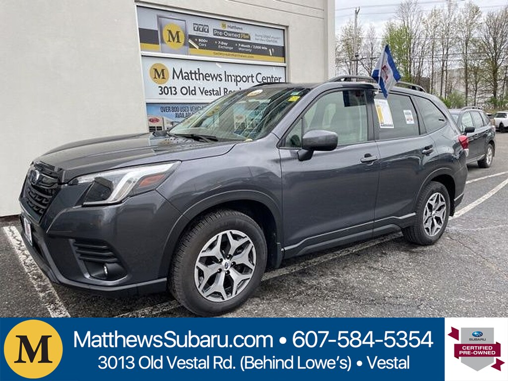 Certified. Gray Metallic 2024 Subaru Forester Premium AWD Lineartronic CVT 2.5L 4-Cylinder DOHC 16V26/33 City/Highway MPGSubaru Certified Pre-Owned Details: * Warranty Deductible: $0 * Roadside Assistance * 152 Point Inspection * Vehicle History * Transferable Warranty * Powertrain Limited Warranty: 84 Month/100000 Mile (whichever comes first) from original in-service date * SiriusXM 3-Month trial subscription $500 Owner Loyalty coupon & 1 year trial subscription to STARLINKMatthews Import Center promises each customer a thorough and confident 120-point inspection on our used inventory guaranteeing a relaxing and peace-of-mind experience. We are located behind Lowes in Vestal NY. Or call us at (607) 729 - 6261 Matthews Import Center 3013 Old Vestal Road Vestal NY 13850.Odometer is 9250 miles below market average!